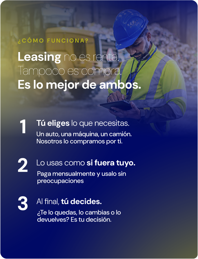 Desde automoviles, equipo de transporte y maquinaria hasta equipo médico, tecnología o software. Si lo necesitas para trabajar, probablemente lo podemos arrendar.